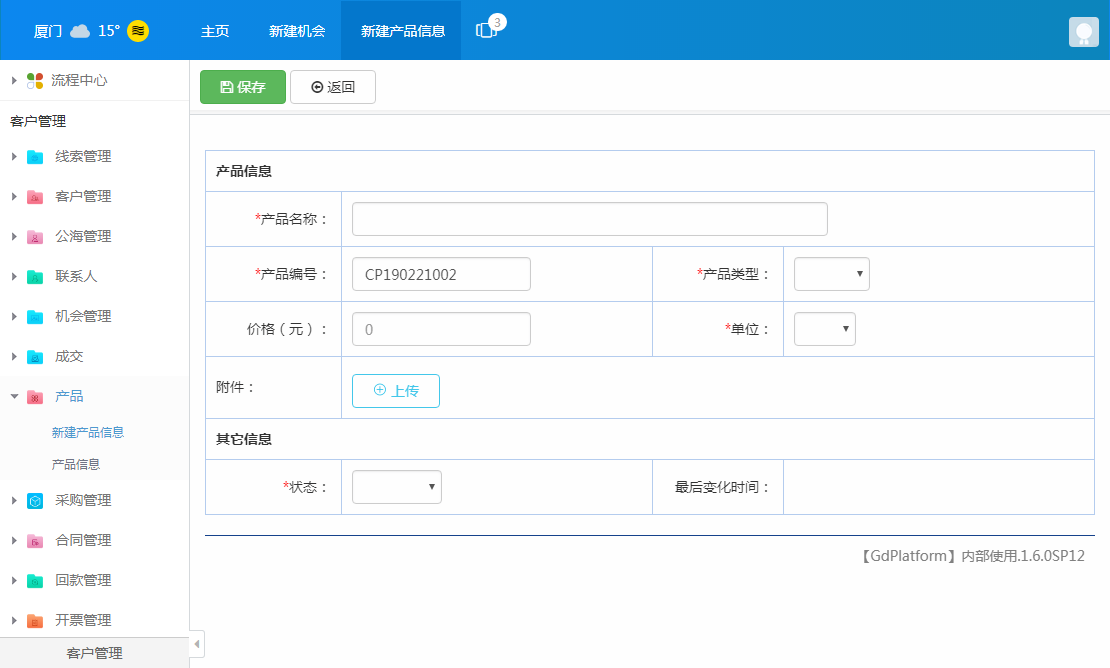 产品信息记录:支持在线创建产品信息,包括金额,单位,类型,编号等。